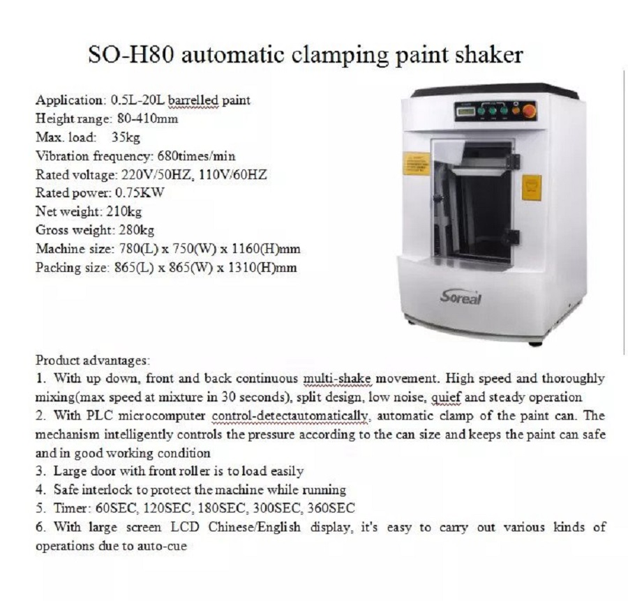 Các loại lon trong máy lắc sơn hình tròn, hình vuông, hình bầu dục. Với chiều cao có thể thích hợp 80 – 410 mm. Đường kính tối đa từ 350mm. Trọng lượng 35kg. Tần số Một pha 110V /220V ± 10% – 50/60 HZ Công suất định mức 750W KÍCH THƯỚC . Kích thước máy lắc sơn shaker 740 (L) X 800W) X 1050 (H) MM Kích thước đóng gói 775 (L) X 845 (W) X 1170 (H) MM Dấu chân 0,59m2 CÂN NẶNG. Trọng lượng máy 229 KG Trọng lượng thô 266 KG